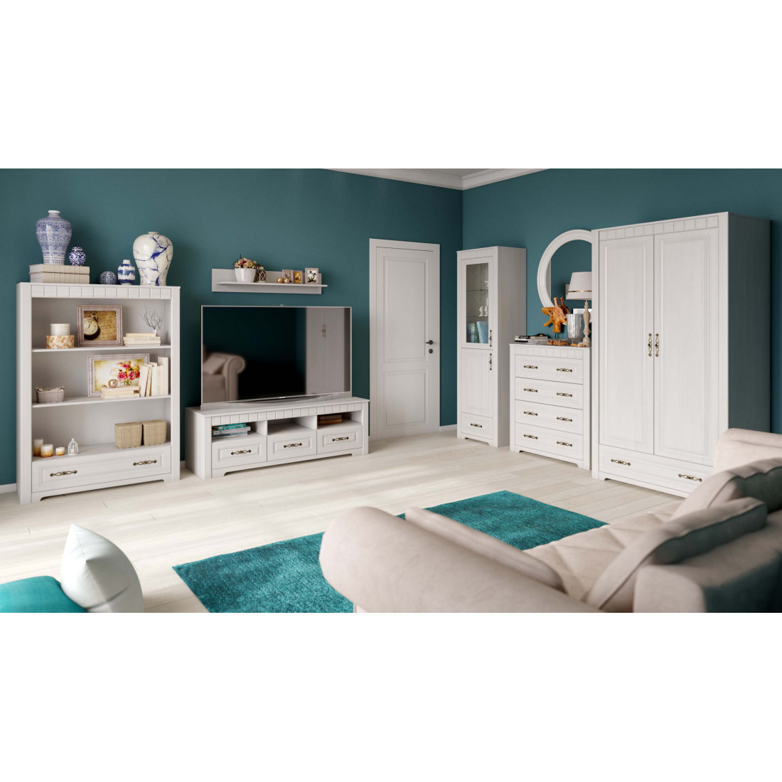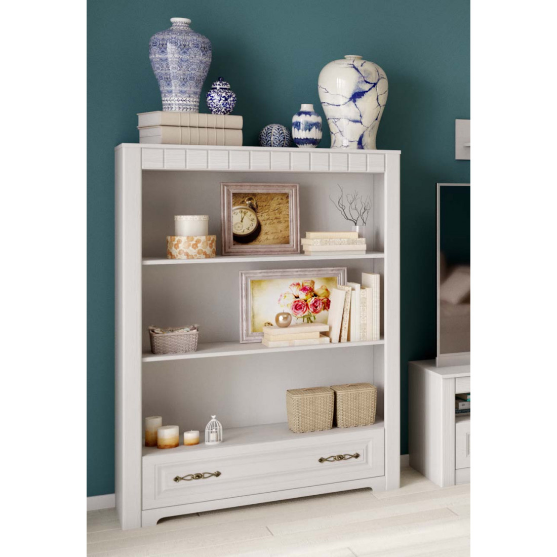Гостиная Прованс композиция 1 от Мебельград - легкие ноты очарования сельской местности, простота линий и домашний уют - вот основные мотивы мебели этого стиля. На полках Вы сможете разместить свои любимые предметы интерьера, книги, вазы, памятные сувениры, которыми завершите образ гостиной.