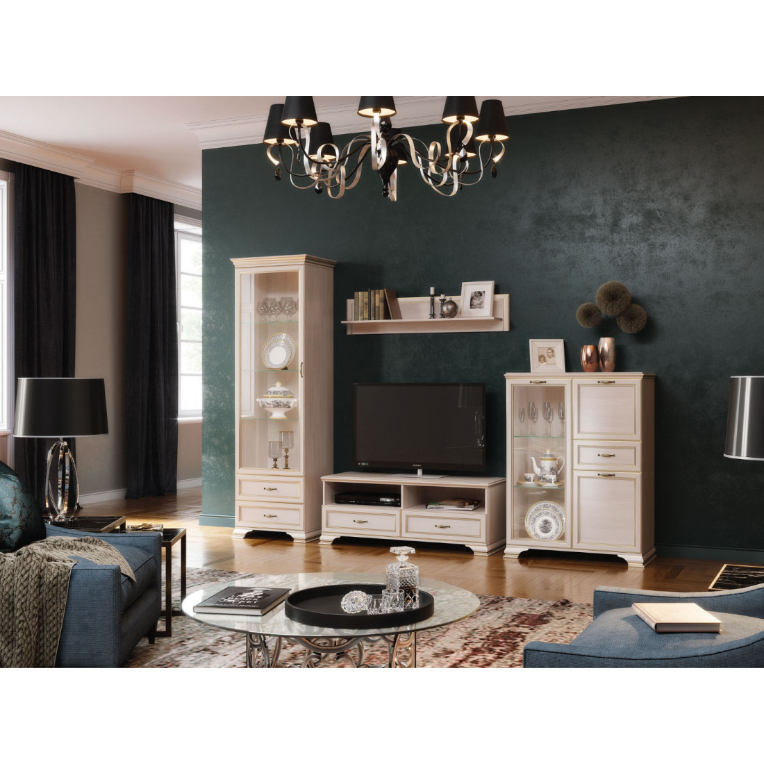 Подбирая мебель для гостиной, вы найдете все необходимые модули для размещения книг, посуды, памятных мелочей и телевизионной техники. Стандартная комплектация шкафа-витрина и шкафов низких предусматривает полки ЛДСП, однако отдельной опцией к ним предлагаются стеклополки.