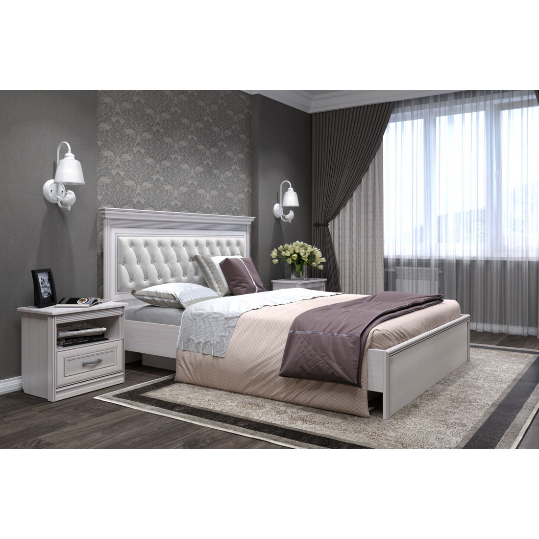 Спальня Неаполь 2 Ясень анкор светлый (патина "серебро") экокожа «polo» белая.
