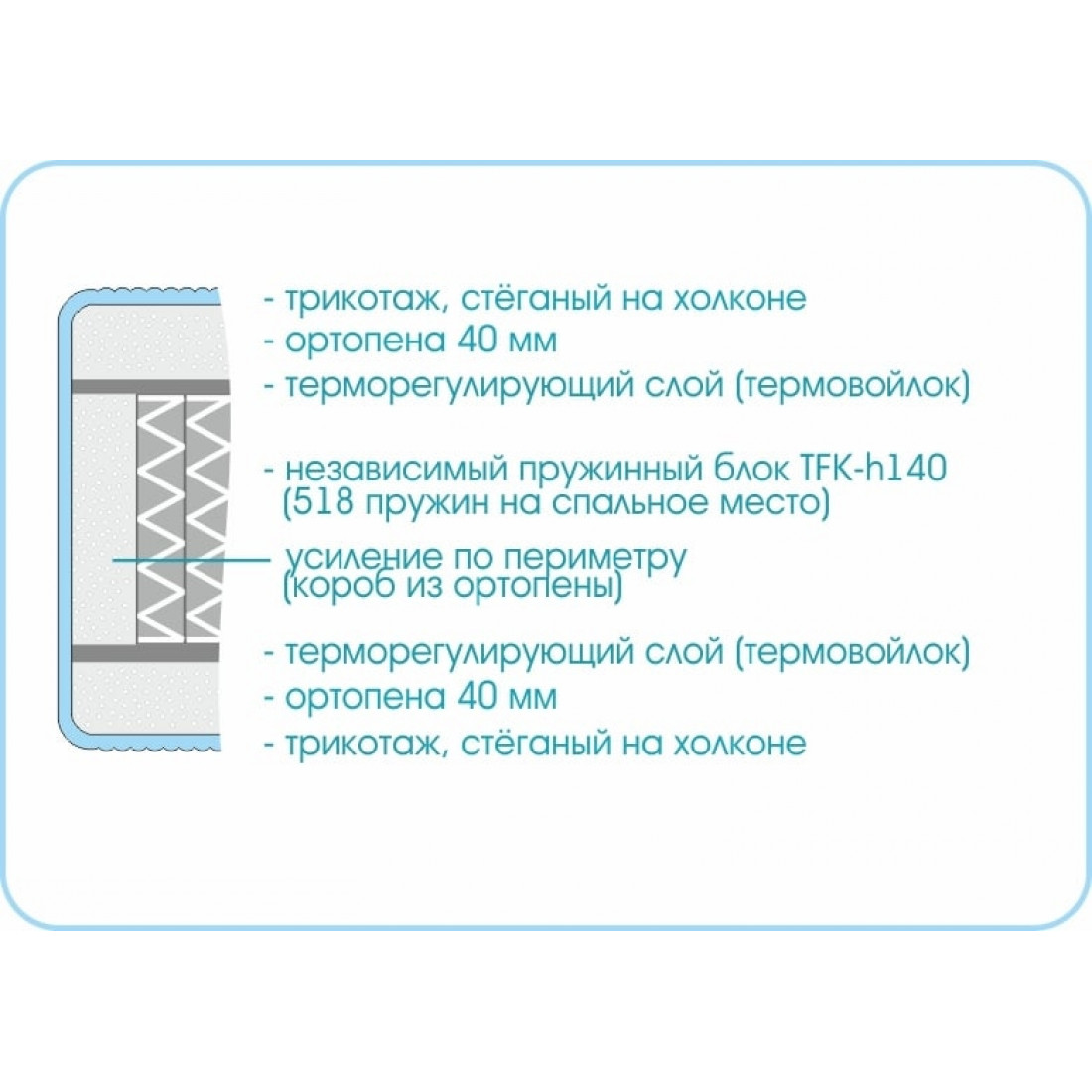 Наполнение: независимый блок TFK, высота блока 140 мм, ортопена 40 мм с двух сторон, терморегулирующий слой с 2-х сторон, усиление по периметру - короб из ортопены.