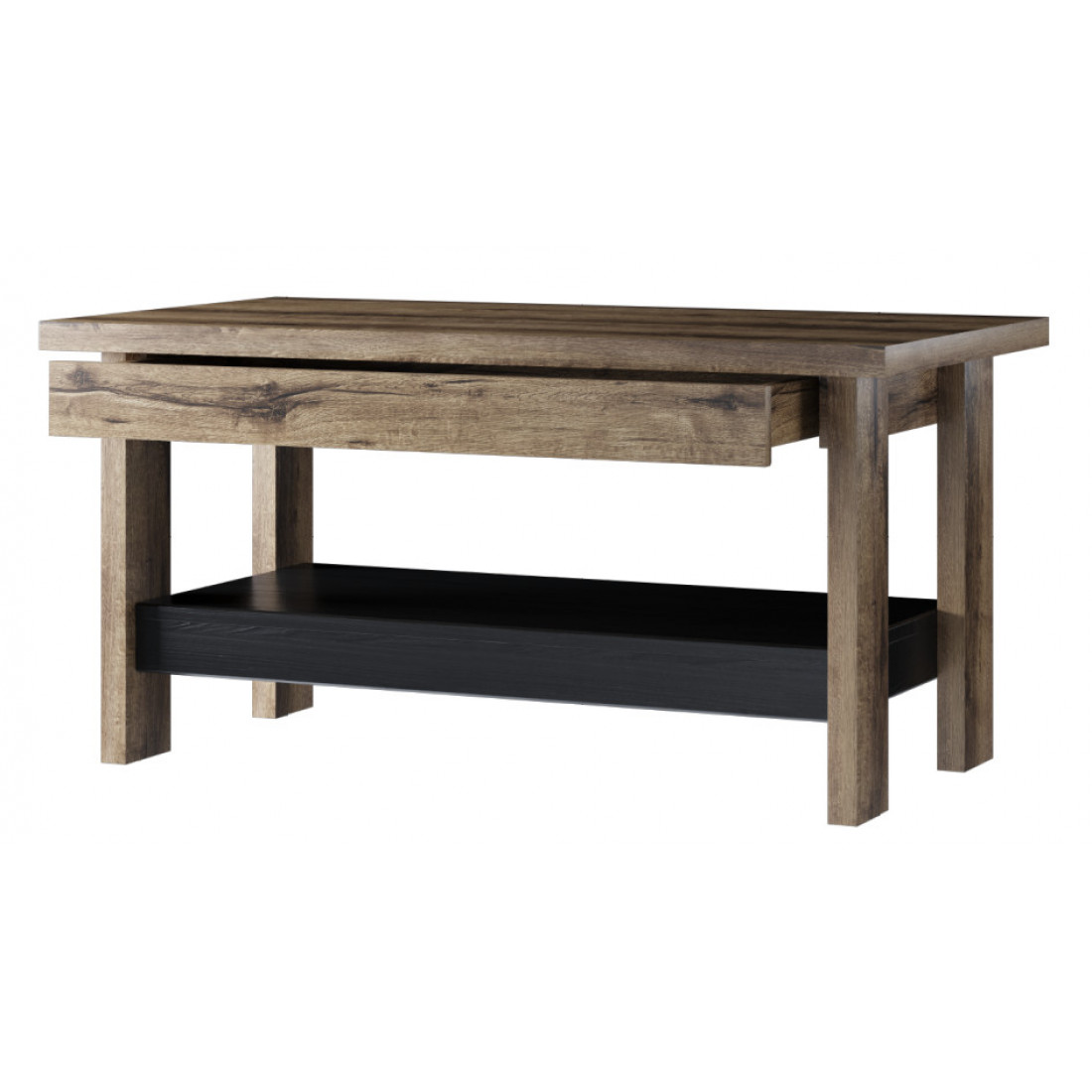 Стол имеет удобную полку в черном цвете, а также выдвижной ящик под верхним щитом.